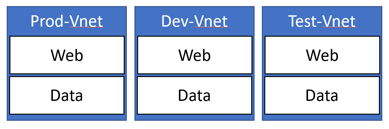 This pattern can be used as part of the previous one, or on it's own. This one usually comes into play when you are hosting IaaS type applications, mostly when you 'lift and shift'. With this model, you would typically have a virtual network per environment (e.g., Production, Development etc.) and then carve it up into separate tiers using subnets. Examples here would include Web, App and Data tiers.